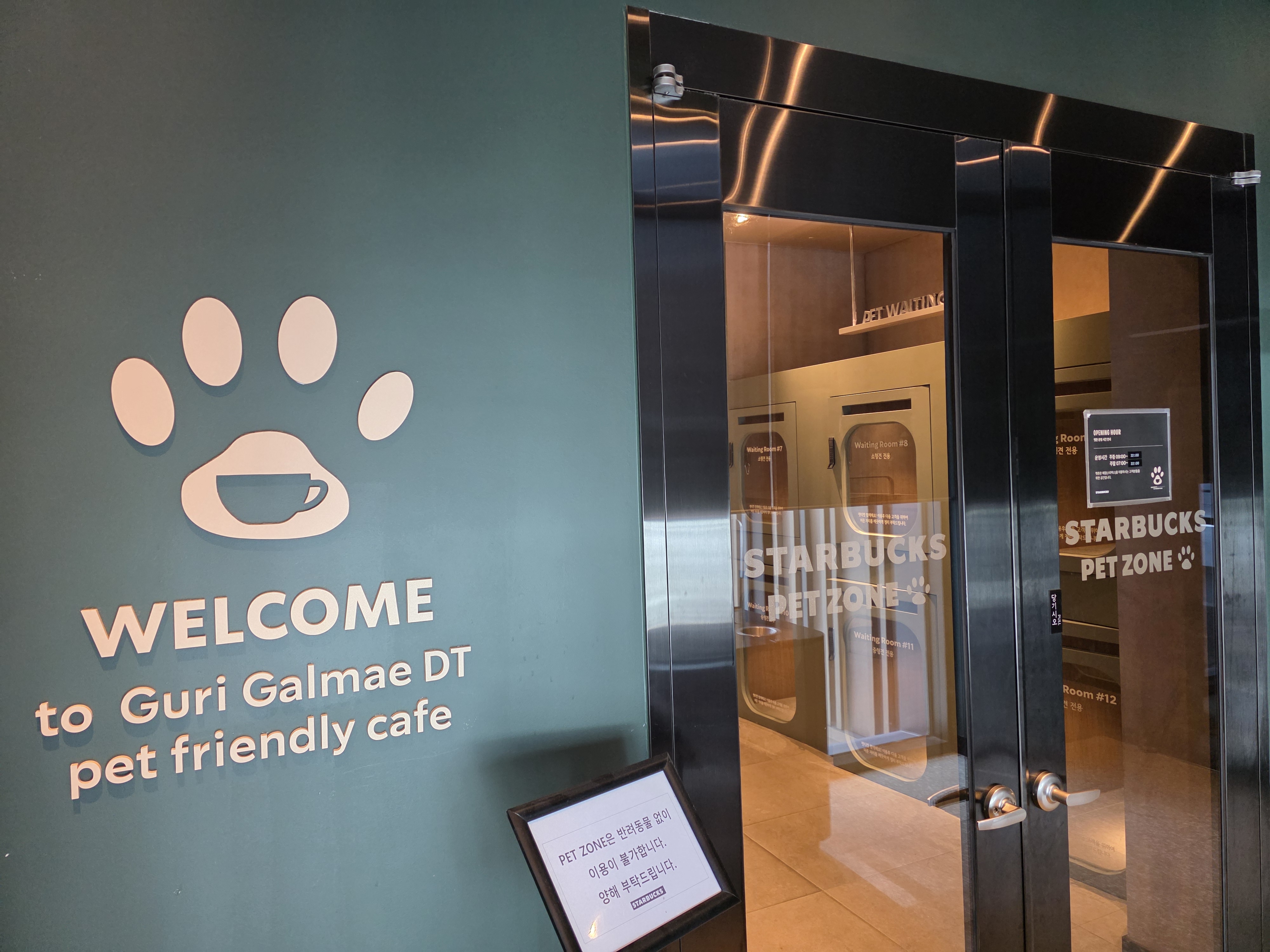 - 입구에 귀여운 발바닥 아이콘과 함께 Pet Friendly 문구가 적혀 있어 반려견을 위한 공간임을 쉽게 알아볼 수