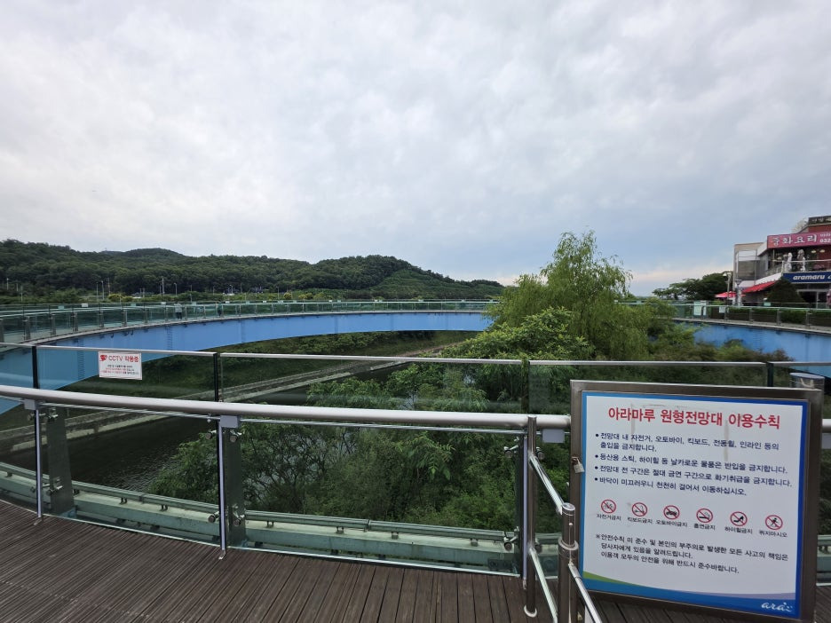 다음으로 아라마루 전망대를 방문했습니다. 이곳은 둥근 구조로 되어 있고, 자전거를 타고 접근하기 좋아서 라이딩 중 휴식 공간으로도 알맞습니다. 전망대 위에서는 곧게 뻗은 수로를 내려다볼 수 있어 사진 촬영 명소로도 잘 알려져 있습니다.