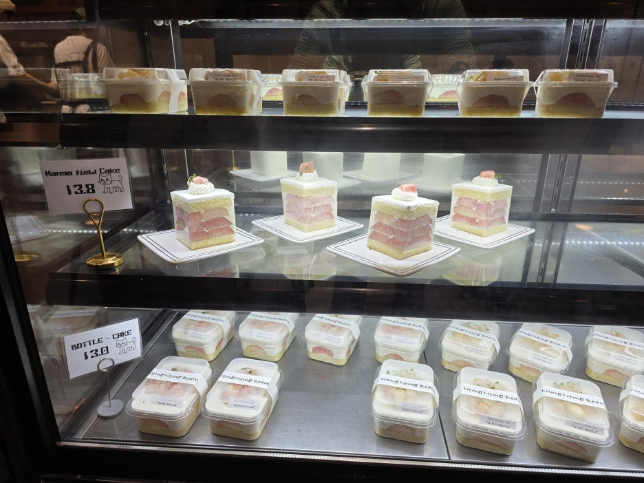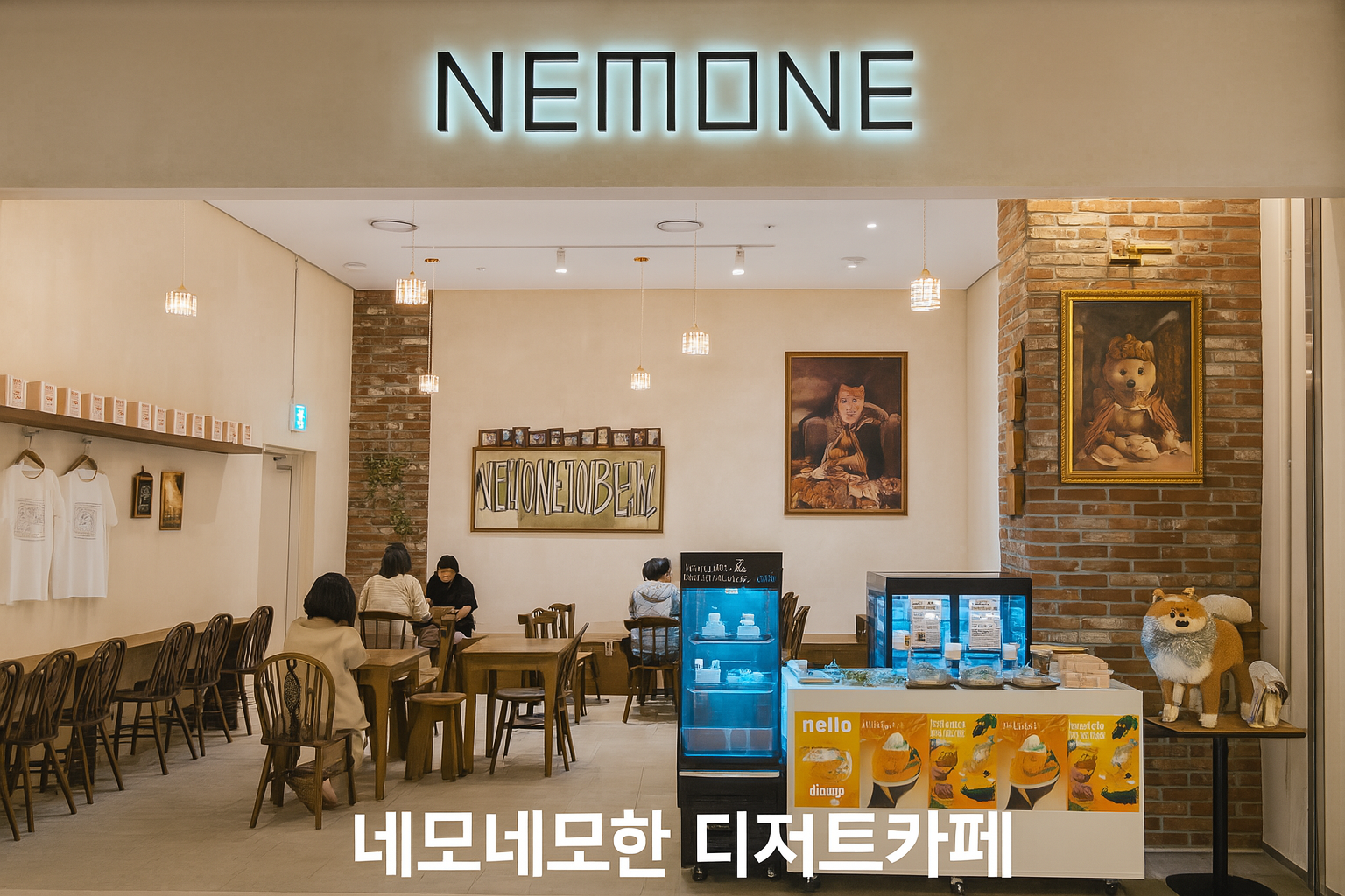 가게에 들어서면 가장 먼저 눈에 띄는 것은 귀여운 네모 캐릭터와 깔끔하게 정돈된 인테리어입니다. 모든 디저트와 식기류가 네모난 모양으로 통일되어 있어 이색적이면서도 통일감 있는 분위기를 자아냅니다. 케이크, 아이스크림, 빙수까지도 네모난 모양으로 제공되어 보는 재미까지 더해주지요.