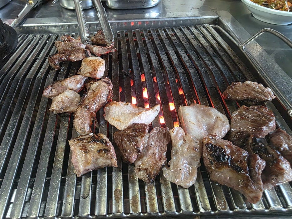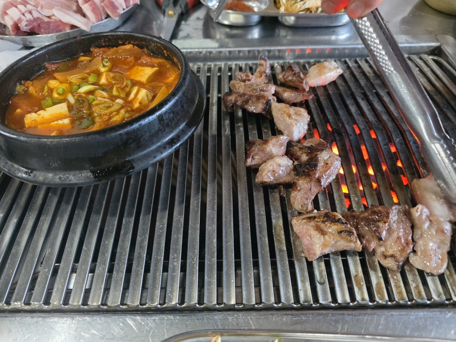 연탄불에 직접 구워먹는 고기는 역시 특별한 매력이 있습니다. 숯불과는 또 다른 깊은 불향이 은은하게 스며들어 고기 본연의 맛을 한층 더 풍부하게 만들어줍니다. 불 위에 올려놓으면 지글지글 익어가는 소리와 함께 육즙이 살아 움직이는 듯 터져 나오고, 고소한 향이 주위를 가득 메우며 식욕을 자극합니다. 특히 두툼하게 썬 삼겹살과 목살은 겉은 바삭하면서 속은 촉촉하게 익어, 씹을 때마다 육즙이 흘러나와 입안을 가득 채웠습니다. 여기에 연탄불 향이 배어들어 고기 맛의 깊이가 남달랐습니다.