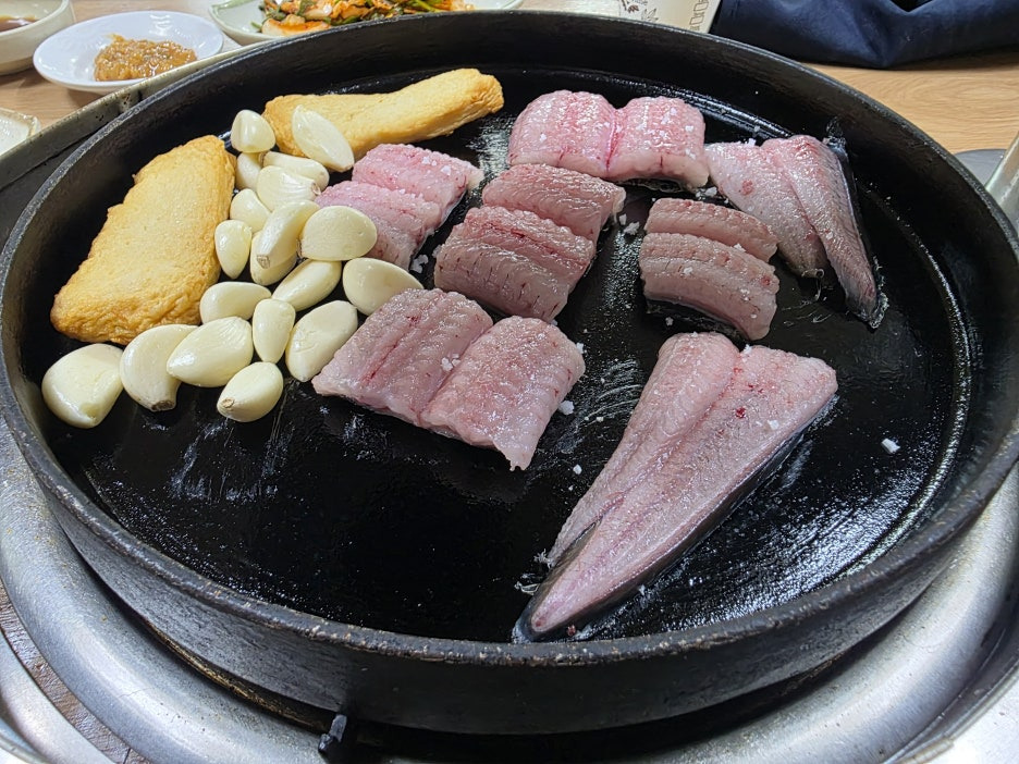 이곳의 가장 큰 특징은 대도식당 등에서 볼 수 있는 등심구이용 철판을 사용한다는 점입니다. 숯불이 아닌 철판에서 소금을 솔솔 뿌려 장어를 구워 먹는데, 기름기가 적당히 배어나오면서도 담백하고 깔끔한 맛이 일품이었습니다.
