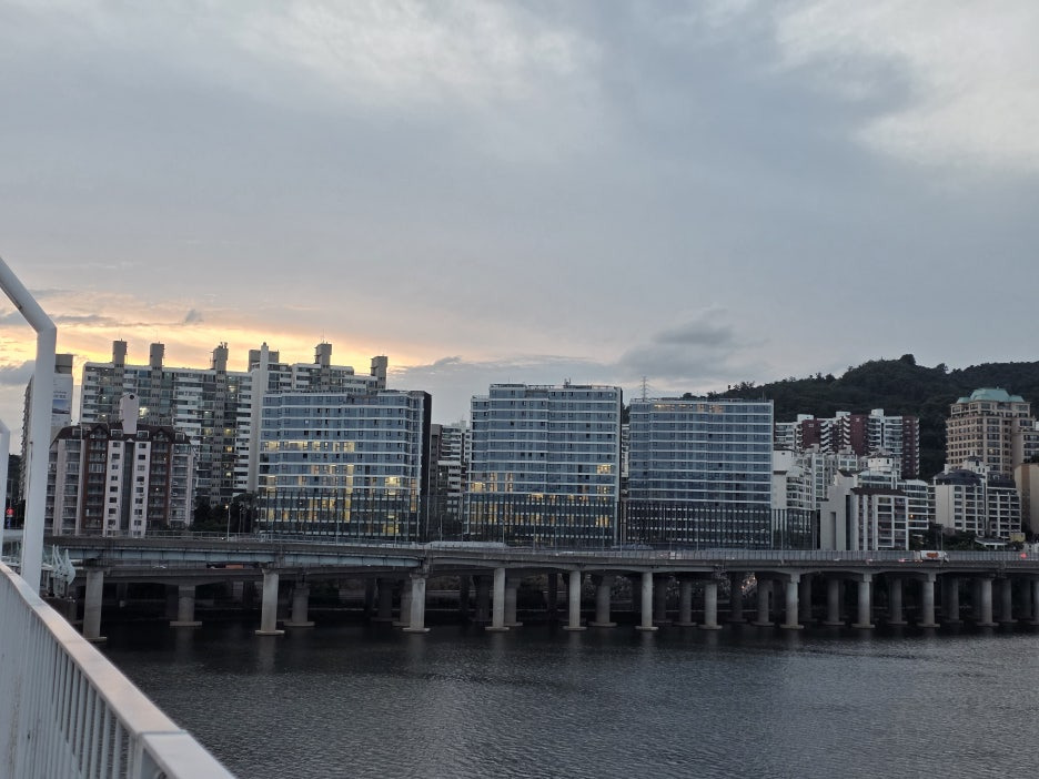 광진교를 열심히 건너며 한강의 노을을 바라봅니다.